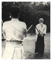 As training advanced, we were taught what we now call ichi no tachi, the first paired sword practice. O-Sensei taught us this one technique for three or four years. The only other thing we did was to continue striking until we were completely exhausted and had become unsteady. When we had reached the point where we were no longer able to move he would signal that that was enough and let us go. That was all we did for morning practice every day. In the last years, I was taught by Sensei almost privately.