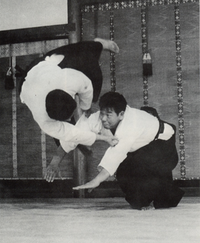 Then, as I stood on the mat in the dojo rolling up my shirt sleeves thinking of myself, "Well, since I've come all the way here I might as well learn a couple of techniques," O-Sensei said, "Come and strike me!" So I went to strike him and tumbled over. I don't know whether it was kotegaeshi or some other technique, but I was thrown. Next he said, "Come and kick me!" When I tried to kick him I was gently overturned. "Come and grab me!" I tried to grab him judo-style and again I was thrown without knowing how. My shirt sleeve and my pants ripped. Sensei said, "Come and train if you like." With that he left the mat. I felt a sigh of relief to think that I was accepted...